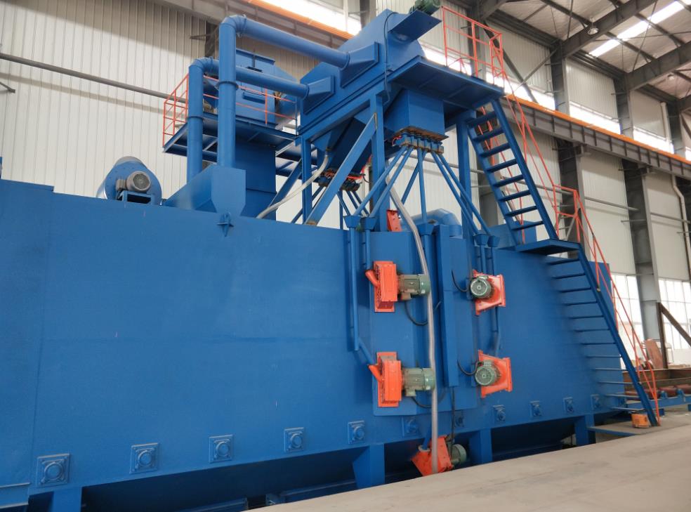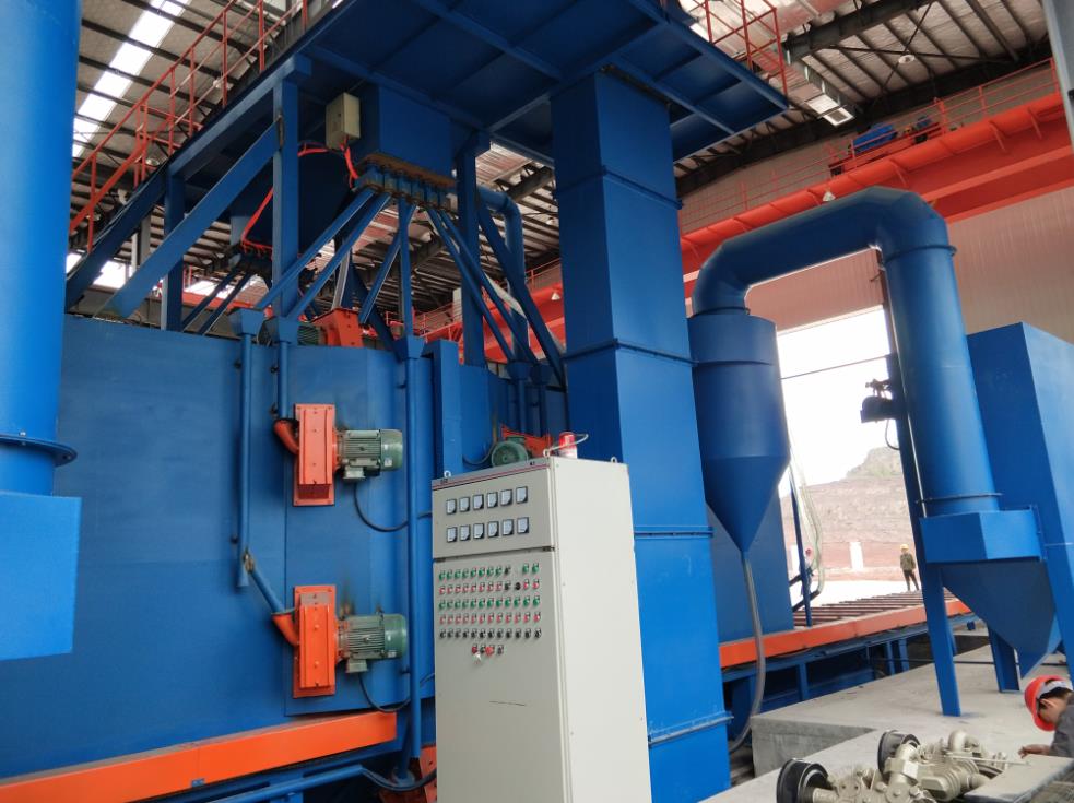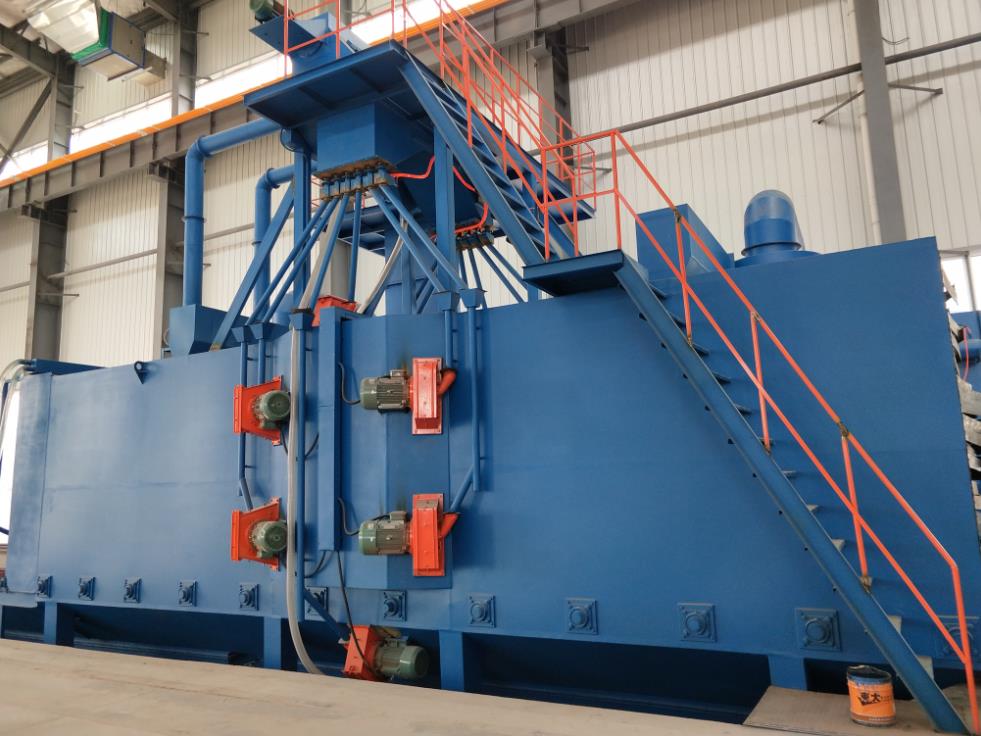 Q69輥道通過式拋丸機系列鋼板,型材拋丸機(臥式)該系列拋丸機型號有Q6910、Q6915、Q6920、Q6925、Q6930、Q6935、Q6940、Q6945等;輥道通過式拋丸機以貫穿清理室的機動輥道為工件的運載裝置,工件在前進的同時接受多角度的拋射清理,采用連續通過式作業方式;該設備和預熱、噴漆、烘干等工序組成流水線,廣泛應用于船舶、汽車、機車車輛、橋梁、鋼結構、機械等行業的鋼板、型材及結構件的預處理工藝;處理鋼板厚度1.5~100mm,寬度1000~4800mm;清理型材高度300~800mm;輥道輸送速度(無級調速)0.5~6m/min;采用常規控制或PLC控制。